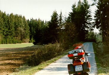 Wenn linker Hand die Häuser auf dem Berg erscheinen, ist es bald geschafft. Es geht bergab zum Bach, den wir kurz begleiten und uns dann auf der Hauptstraße in Richtung Wüstenstein davonmachen. Die kleine aber saugut zu fahrende Straße über Gößmannsberg und Voigendorf sorgt für Fahrfreude. Landschaftlich romantisch wird es hinunter ins Tal der Aufseß. Wir lassen Seelig links liegen und treiben das Motorrad durch die Kurven über Hochstahl und Schressendorf bis nach Plankenfels. Hier folgen wir der Beschilderung nach Bayreuth. Die evtl. noch bestehende Straßensperrung sollte nicht interessieren, da wir vor der Baustelle nach Plankenstein abbiegen und die Straße bis dorthin frei ist. Hier beginnt ein kleines Sträßchen bis nach Truppach. Wer solche Straßen fährt, braucht eigentlich keinen Feldweg mehr!