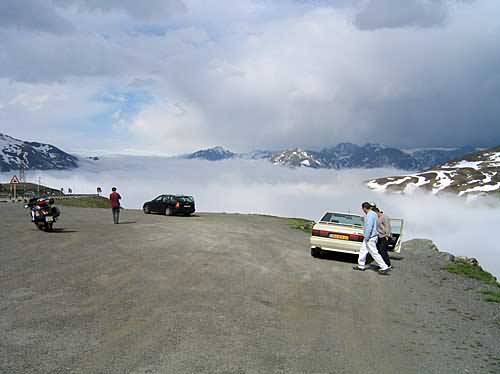 Bei schönem Wetter verlassen wir die Stadt Andorra und freuen uns noch über die gegen Deutschland um 40 Cent billigeren Spritpreise. Die Envalira hoch zeigen sich am Himmel erste dunkle Wolken. Aha, die Grenze naht. Wir fahren höher und höher. An der Passhöhe zeigt das GPS schließlich 2422 m über NN! Der Blick hinunter nach Frankreich: fantastisch! Wir stehen über den Wolken, die grellweiße Nebelbank beginnt so zwei bis drei Kehren unter uns und reicht so weit das Auge reicht. Aus der Watte heraus ragen nur noch die höchsten Gipfel und leuchten in der Nachmittagssonne.